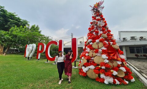 Di perpustakaan PCU terdapat pohon setinggi tujuh meter menggunakan 183 kipas kertas khas ornamen Tionghoa